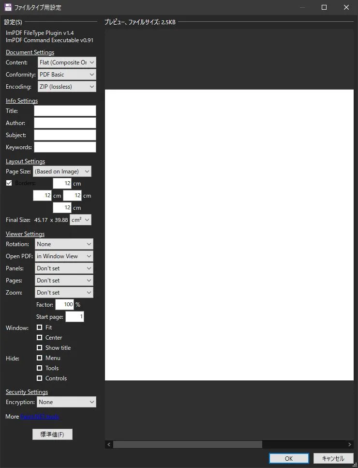 PDFファイルのタイトルや作成者の設定ができます。 上からTitle(タイトル)、Author(作成者)、Subject(件名)、Keyword(キーワード)。