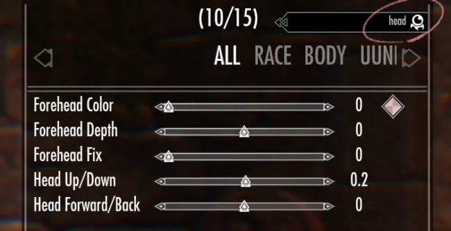 残念ながら日本語入力はゲームの仕様上できない(参考:THE ELDER SCROLLS V: SKYRIMでは、日本語で名前を入力できますか?)のですが、筆者のように英語のまま翻訳せずに使う場合は、Head(頭)、Forehead(額)、Brow(眉)、Eye(目)、鼻(Nose)、Cheek(頬)、Mouth(口)、Jaw(顎)、Chin(おとがい/顎先端)等、部位の名称を覚えておくと微調整に便利かも……。
