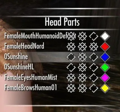 チェックボックスは左から、テクスチャ表示の有無、ワイヤーフレーム表示の有無、編集の可否、ワイヤーフレームの色となっています(オンマウスで説明が見られます)。 デフォルトは画像のように顔というか頭(この場合はFemaleHeadNord)のみ編集可能になっているので、他を編集したい場合はここを切り替えます。