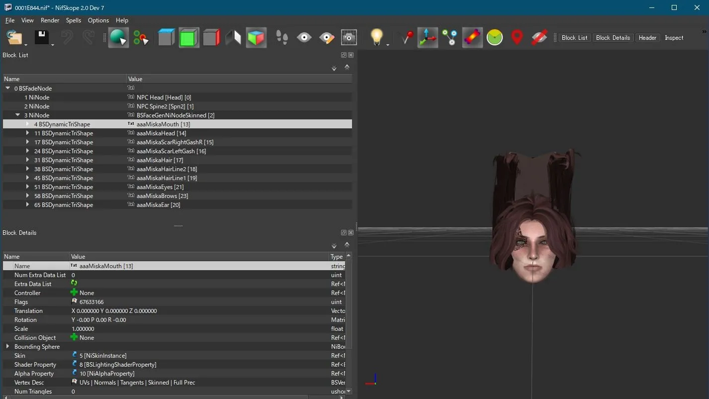 CKでの作業は以上です。続いてNifskopeで作業の続きをします。 ヘッドメッシュを開きます。