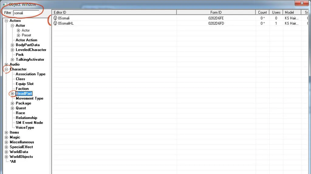 2. 髪型を選択します。 Character→HeadPartsと展開し、髪型名をウィンドウ右上のFilterに入力して検索。 髪型本体とヘアラインの2件がヒットするので、このふたつを編集します。