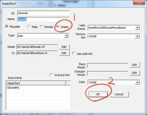 3. 区分をUnisexに設定します。 最初はラジオボタンがFemaleに入っていますが、Unisexに変更。 髪型・ヘアラインとも同様の作業を行ってください。