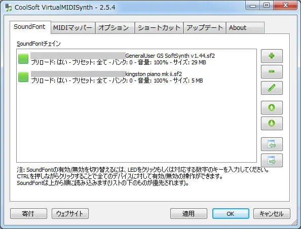 ちなみに”-“で削除、上下矢印で優先度の切り替え。鉛筆マークはプロパティ。 また、左の■マークをクリックで各サウンドフォントの有効/無効を切り替えできます。