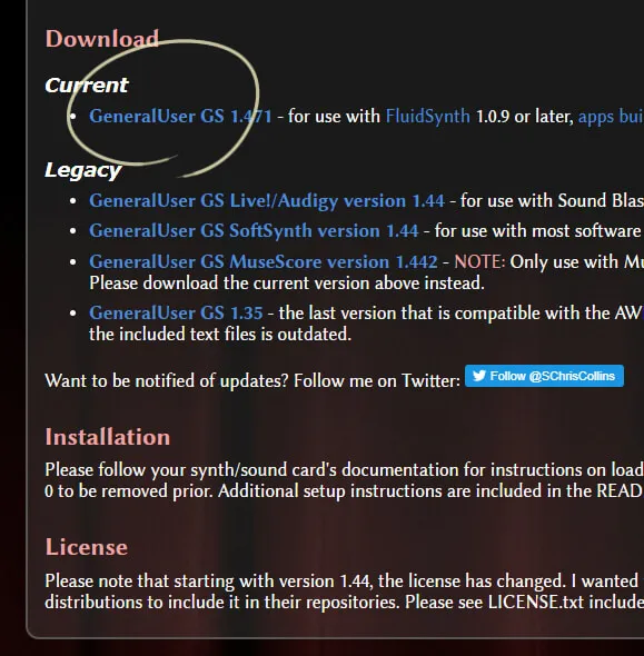 今回は試しにGeneralUser GSを導入してみます。ソツのない音色が揃っているセット音源です。 ページ下部、“Download”の項の”Current”にあるファイルが最新版です。ダウンロードが完了したらファイルを解凍して適当な場所に保管します。