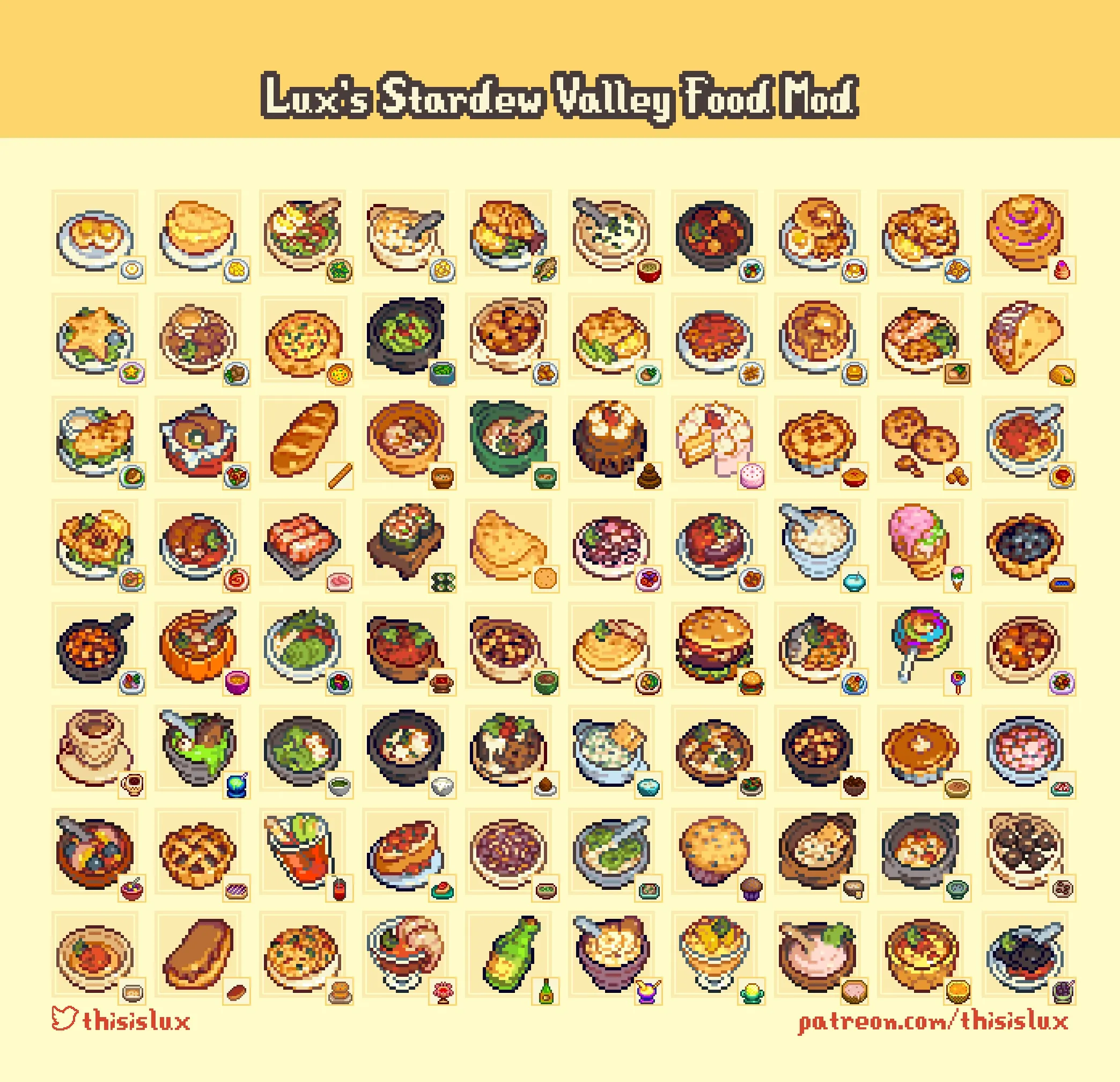 Lux’s Food Mod (SMAPI+PyTK+CP必須) 料理のリプレイス。すべての料理の見た目が置き換えられます。 スケーリング表示と等倍表示の2種類のファイルが同梱されており、手動でファイルを差し替えることにより等倍表示にすることも可能です。詳細はdescへ。