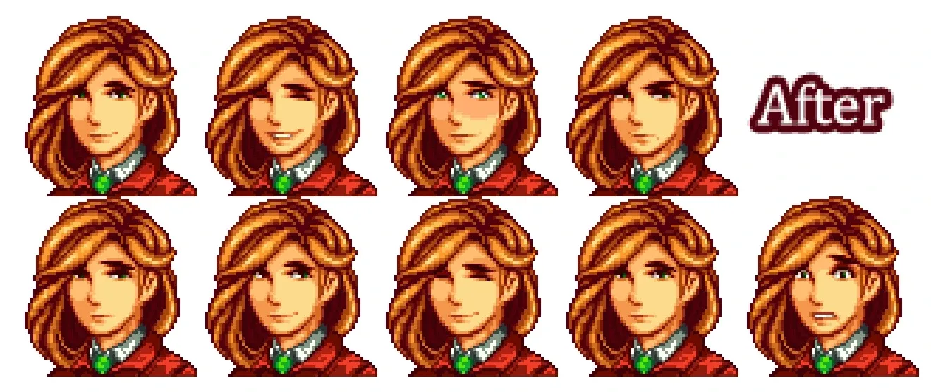 【CP/Portraiture】漫画タッチの表情豊かなポートレート。表情差分が個性的で楽しいです(Abbyの驚き顔が好き)。CP対応の標準解像度版と、Portraiture対応の高解像度版があります。 Stardew Valley ExpandedやCombined Girl Mod等に対応したファイルもオプションとして用意されています。別URLにSeasonal Outfits対応版もあります。