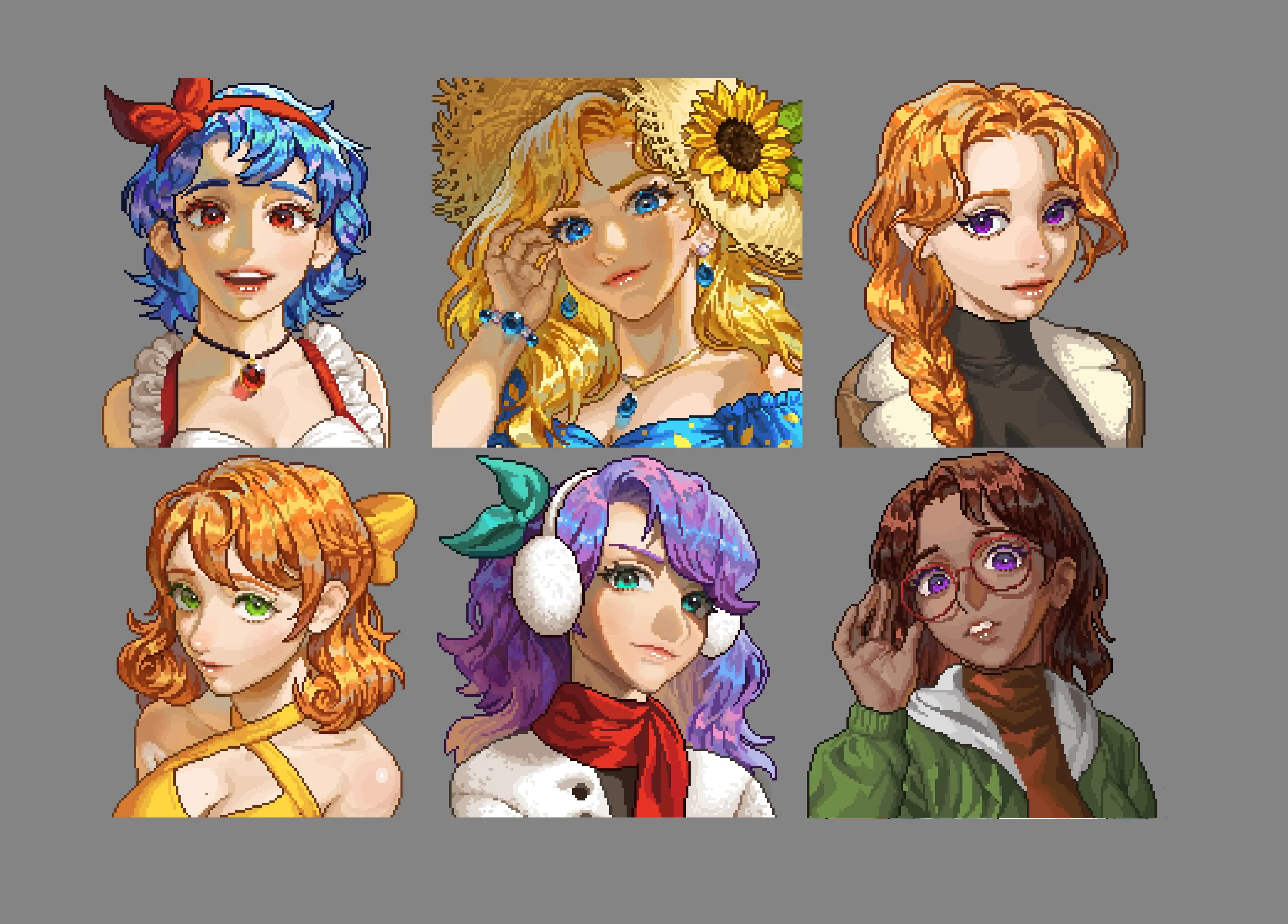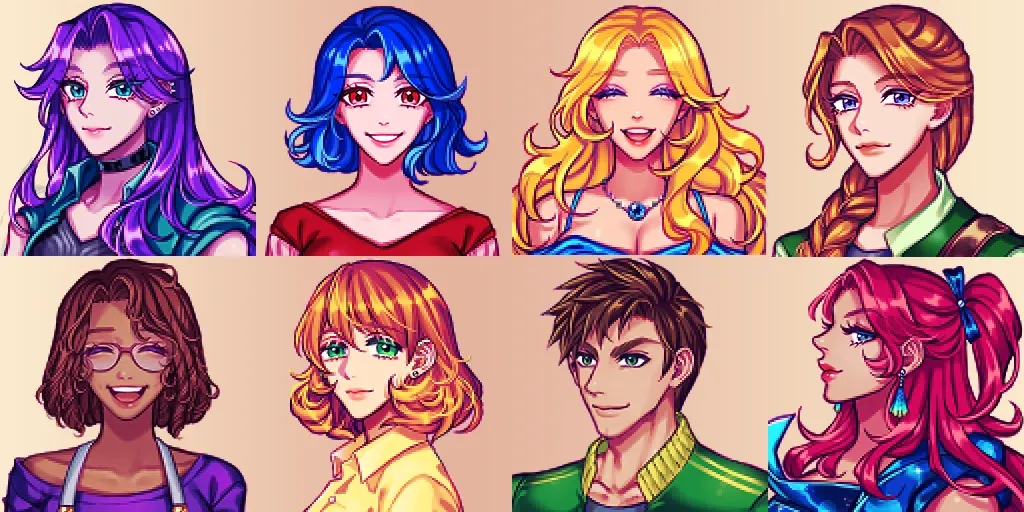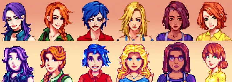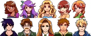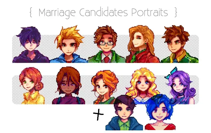 【CP/XNB】結婚対象キャラ12名+一部村人のアニメチックで可愛らしいポートレート。Liah、Maru、Abigailは2種類から選べます。 Seasonal Outfits対応版もあり。