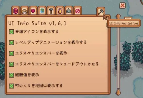 Ui Info Suite2 非常に多機能なUI拡張mod。これひとつでいきなり便利になります。 ゲーム内設定(コンフィグ右端に出現する斧マークのタブ)からいずれの機能も個別にオンオフが切り替え可能なので、これはちょっと見えすぎかな、となっても安心。自分はNPCの位置表示機能のみオフにしてます。