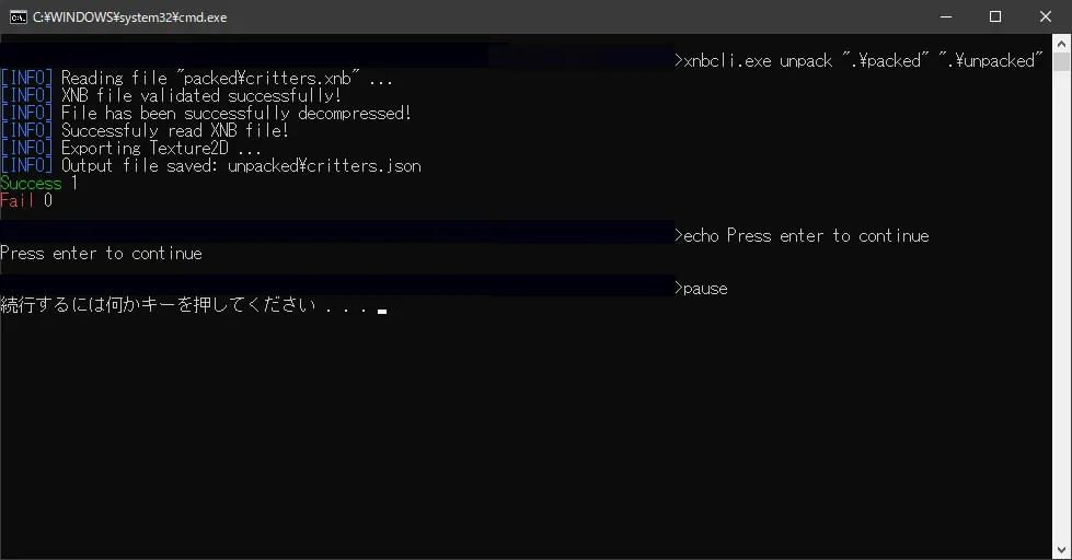- unpack.datを実行します。メッセージおよび失敗数/成功数がコマンドライン上に表示されるので確認してください。展開されたPNGファイルはunpackedフォルダの中に入っています。