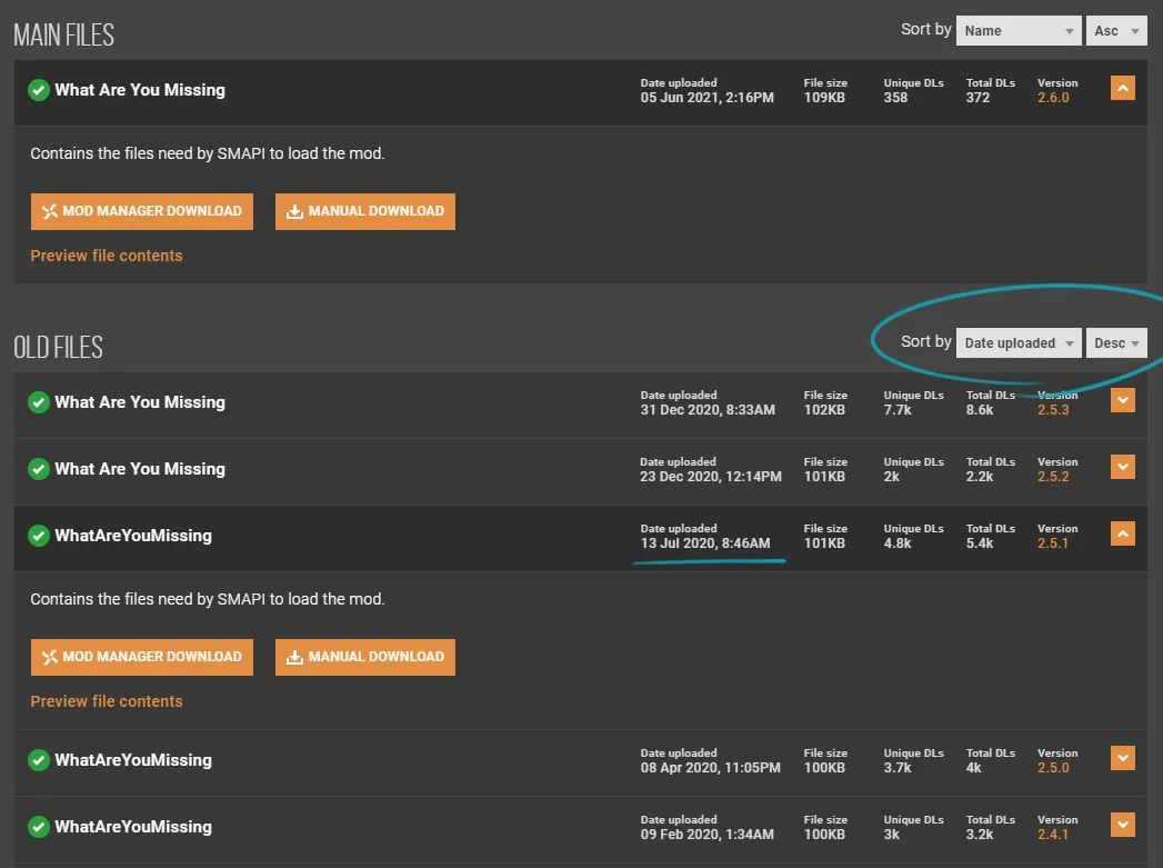 その場合はOld Filesを参照し、SMAPI4.0.6用のファイルを探します。具体的には、4.0.7のリリース日である2024年4月18日以前に公開されているものです。
