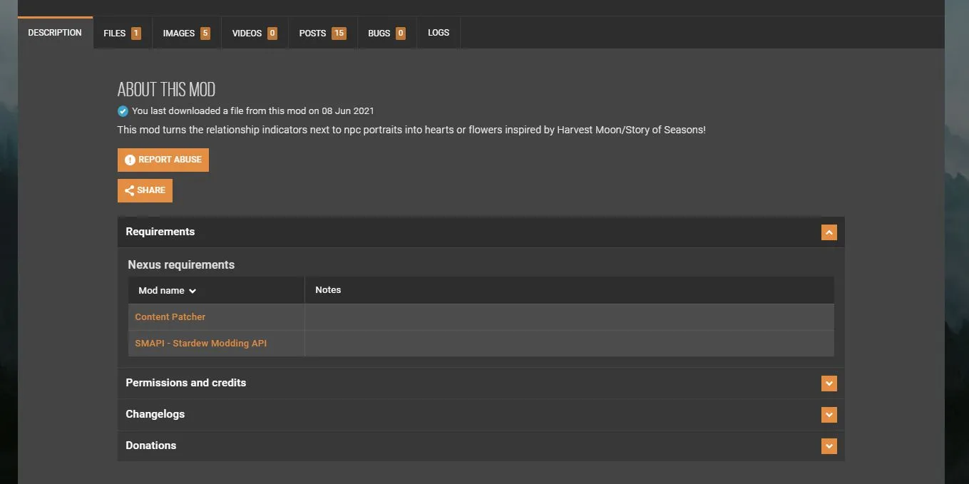Nexus requirementsおよびOff-site requirementsに指定されているものが必須modです。画像のRan’s HeartsではSMAPIとContent Patcherのふたつが指定されています。