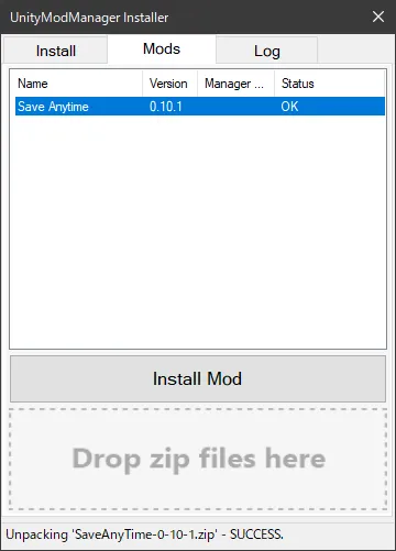 UMMを起動して”Mods”タブに移動します。 “Install Mod”でzipファイルを直接指定するか、“Drop zip files here”のところにzipファイルをドロップするとリストに載ります。